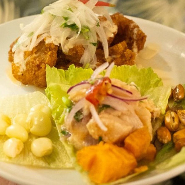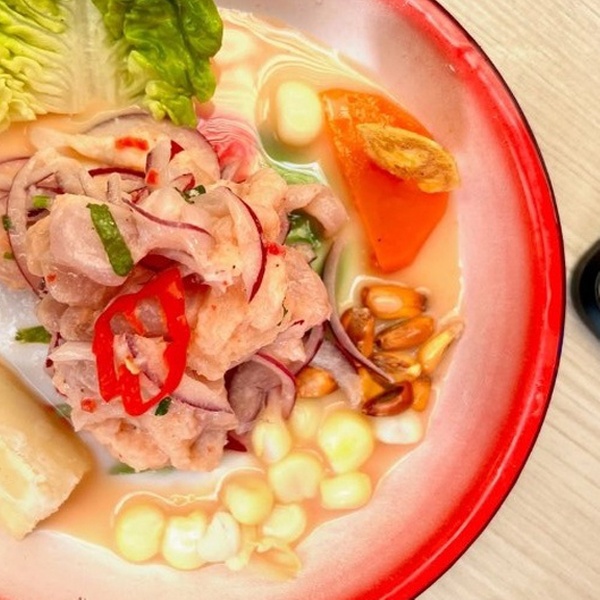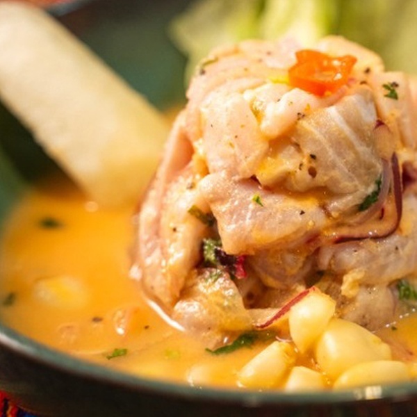 - Ceviche de pescado: mero macerado con limón, especias, cebolla y aji.