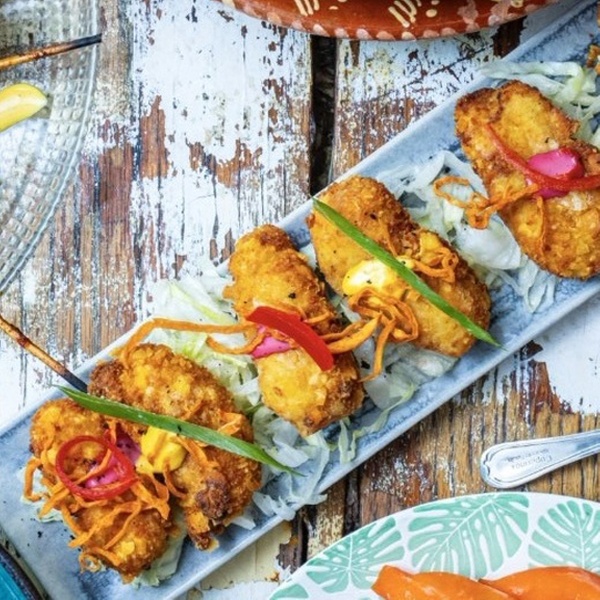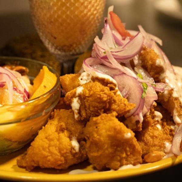 - Chicharrón de Pescado: Tiras de pescado arrebozadas y fritas servidas con yuca frita, sarsa de cebolla y salsa tártara