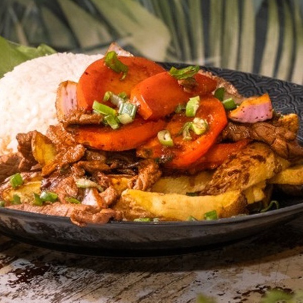 - Lomo salteado con arroz y papas fritas