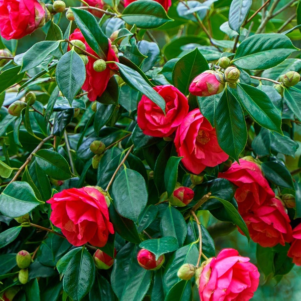 La Camellia Japonica Dr. King, también conocida como rosa japonesa, florece a finales del invierno para dar la bienvenida a la primavera