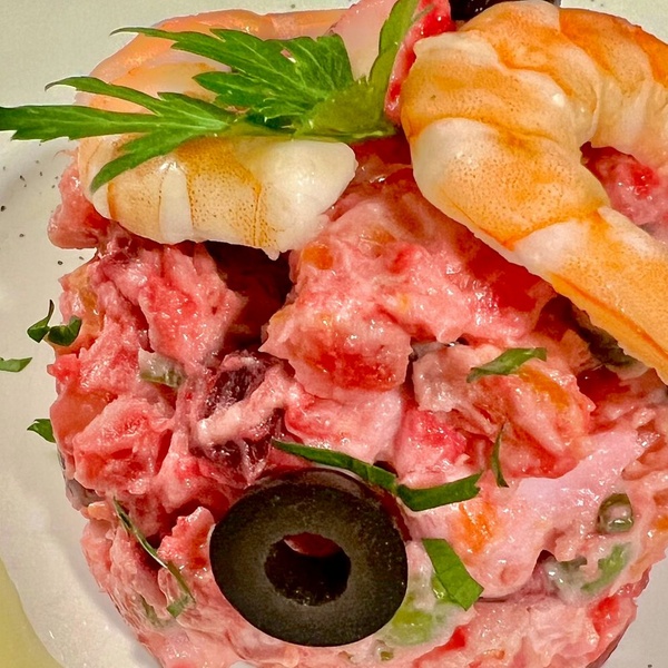 Olivo roll: Langostino, aguacate, queso crema y por fuera tartar de pulpo al olivo