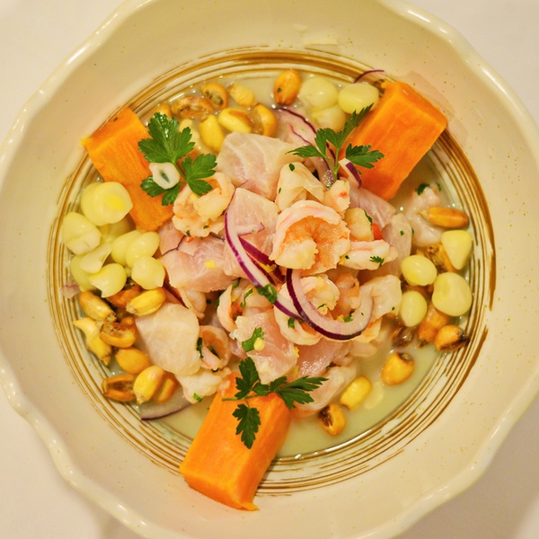Acevichado: langostino, aguacate y por fuera láminas de atún bañadas en salsa acevichada