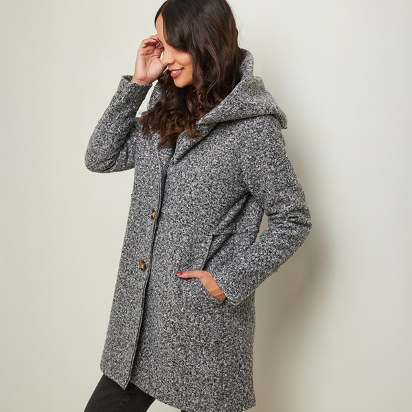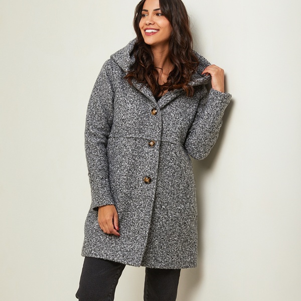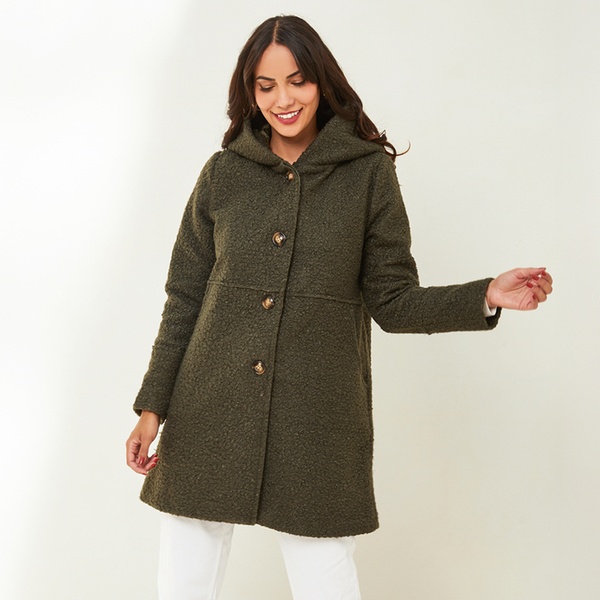 - Con corte clásico recto, cuello en pico, botones y capucha