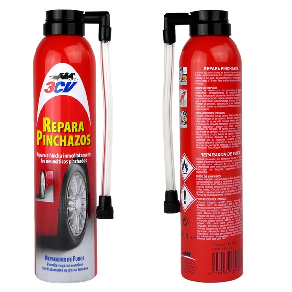 - Aerosol a presión, a la vez que repara el pinchazo, también hincha el neumático, dejándolo listo para su uso