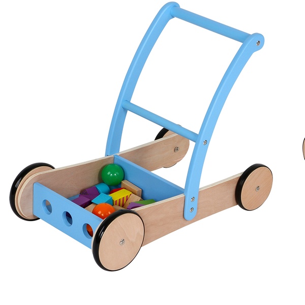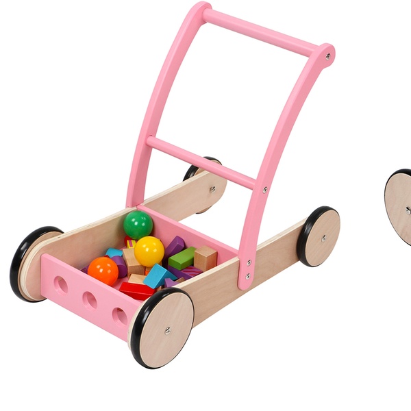 Andador de madera con ruedas que aportan estabilidad y seguridad, ideal para ayudar al niño cuando empieza a dar sus primeros pasos