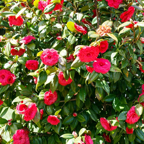 Con flores vibrantes en diferentes tonos, este arbusto de Camellia ilumina cualquier jardín con su esplendor japonés