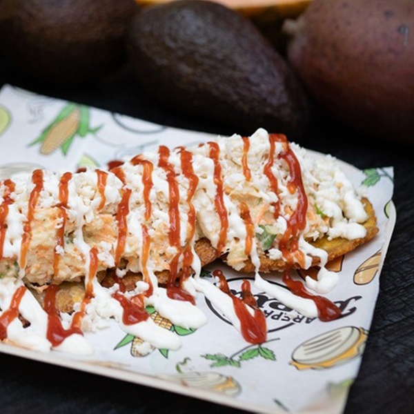 - Tostones playeros (3 uds): crujientes rodajas de plátanos macho verde, coronadas con ensalada americana, cremosas salsas y queso llanero venezolano