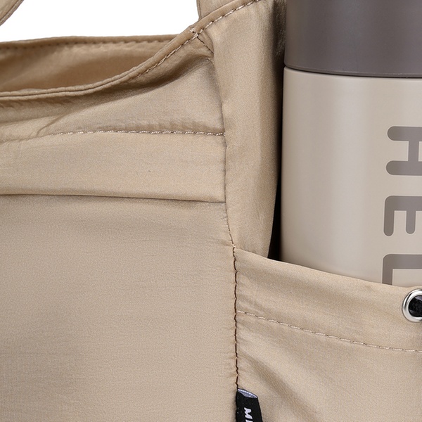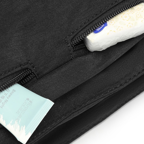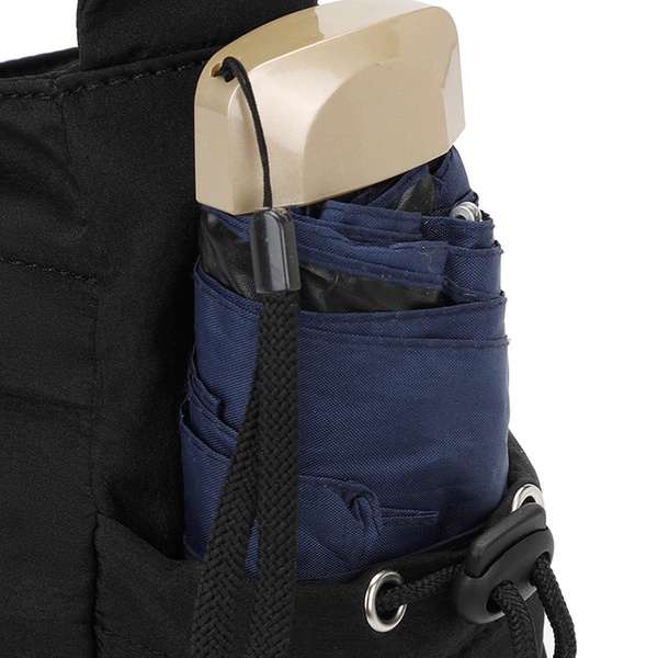 - Amplio espacio de almacenamiento con dos cremalleras delanteras ocultas para los objetos más pequeños y dos bolsillos laterales elásticos perfectos para botellas de agua o paraguas