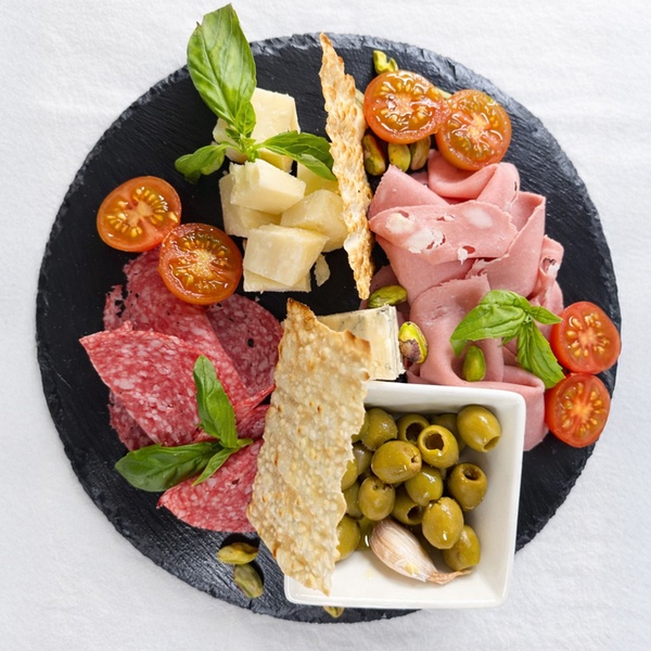 Degustación de antipasto: una pizarra para compartir con una cuidada selección de productos italianos