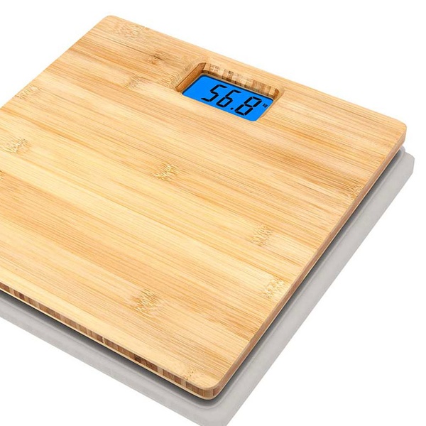 Esta báscula corporal electrónica de bambú tiene incorporada una pantalla LED LCD HD azul así como un sensor de encendido/apagado automático