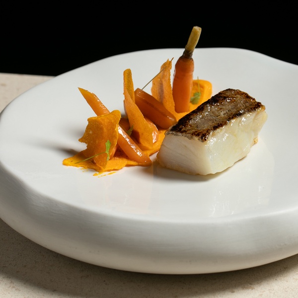 Sua eta haize gorria...''El fuego y el viento rojo'': Bacalao al calor de la brasa, zanahoria en texturas y migas de pan orgánico
