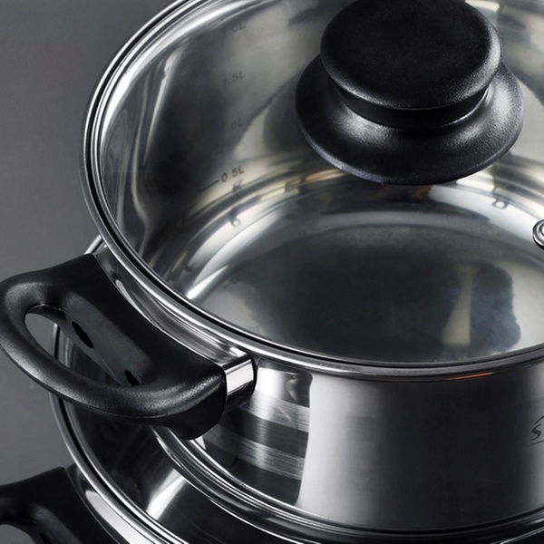 - 2 ollas de: Ø 20 x 11,5 cm y Ø 24 x 13,5 cms (ambos con tapa de cristal con válvula de escape para vapor)