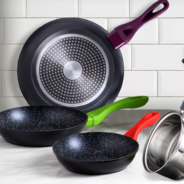 Batería de cocina Toledo compuesta por 8 piezas combinadas con un juego de 3 sartenes de la colección Jolie, que aportan color a la cocina