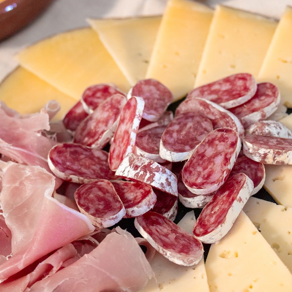 - Aperitivo: jamón serrano de cebo, queso curado, fuet, patatas fritas en aceite, ensaladilla rusa con picatostes