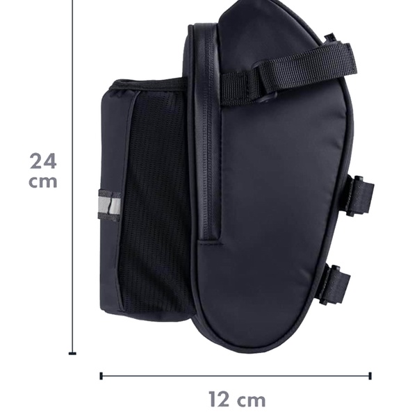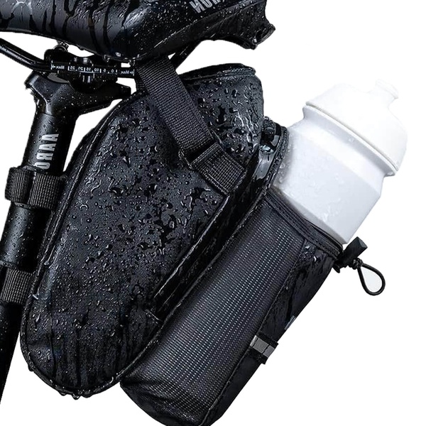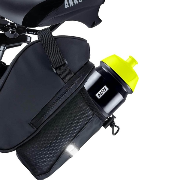 De material impermeable, con un soporte integrado para el bidón de agua y con tiras reflectantes, esta bolsa es ideal para llevar todo lo necesario en las salidas en bici manteniendo la seguridad vial
