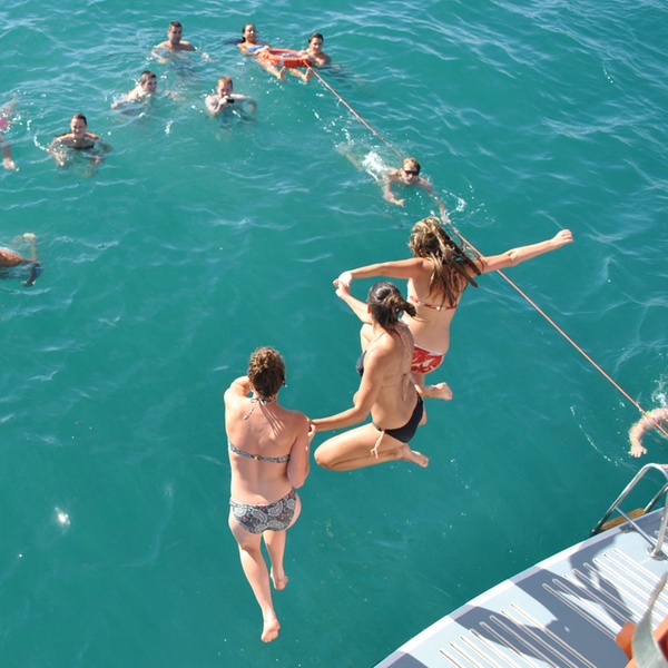 Una travesía en catamarán a motor de 4 horas y media por la costa de Las Rotas, con vistas a la Reserva Natural Marina, la Cova Tallada y los acantilados del cabo de San Antonio. La ruta continúa hacia la Isla de Portitxol, pasando por el puerto de Jávea, hasta fondear en una cala seleccionada por el capitán.