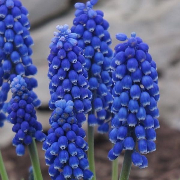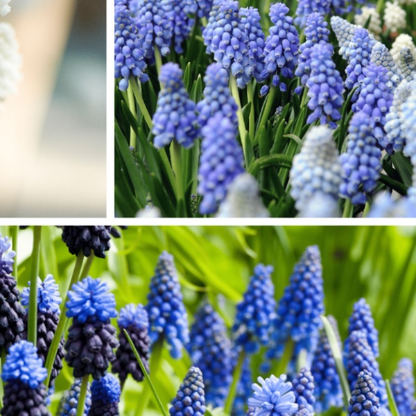 - Sus pequeñas flores azules (Armeniacum) o blancas (White Magic) florecen entre abril y mayo; tienen un aroma agradable que atrae abejas y abejorros.