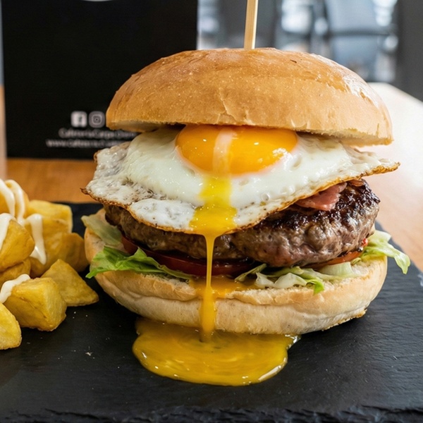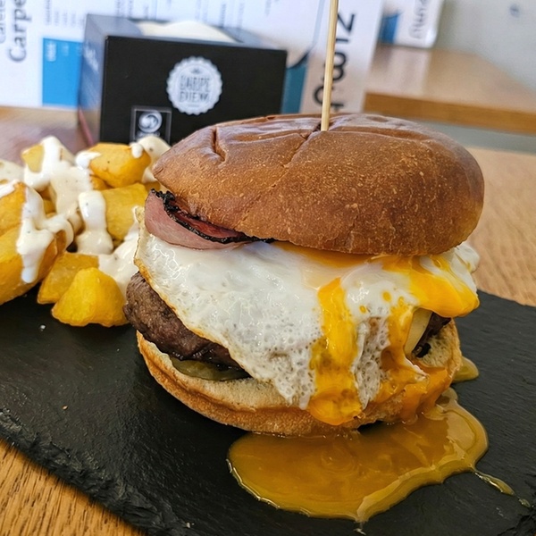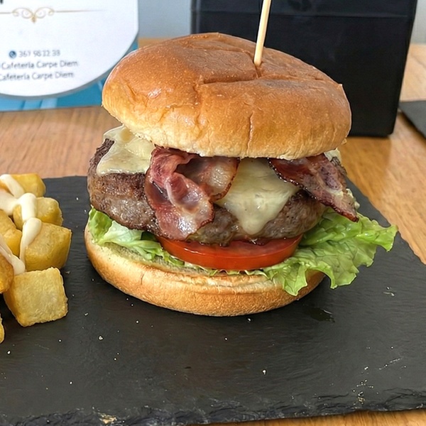 - Hamburguesa Carpe Diem: carne de buey, lechuga, tomate, queso, pepinillo, huevo/bacon acompañada de patatas