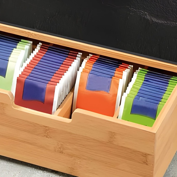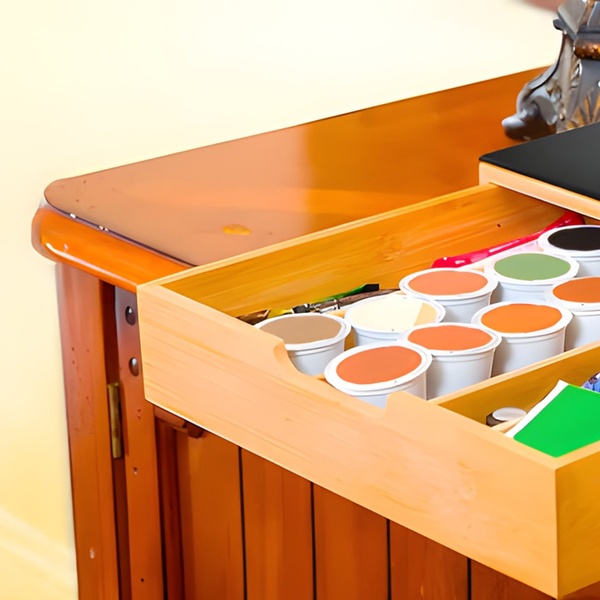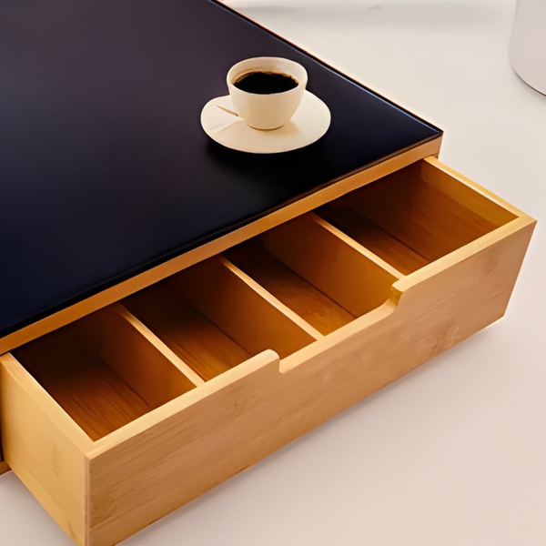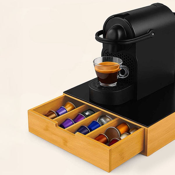 - Cajón con 4 compartimentos para ordenar cápsulas de café, bolsas de té o utensilios de cocina, entre otros