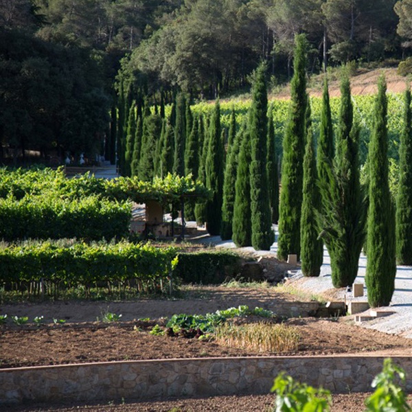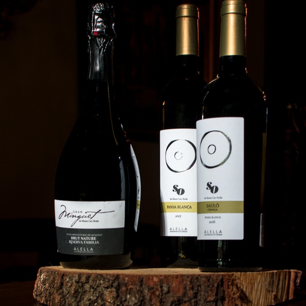la finca dispone de unas siete hectáreas de viñedo de las variedades pasa blanca (la más habitual en el territorio de la D.O. de Alella), moscatel, Merlot y Cabernet.