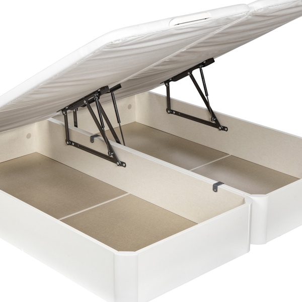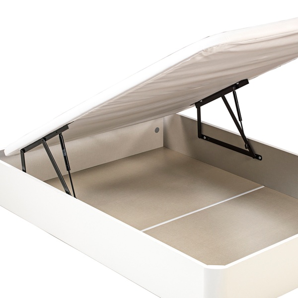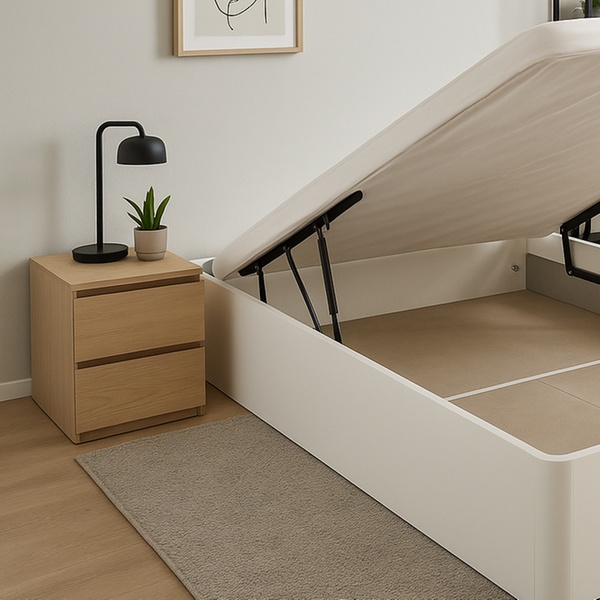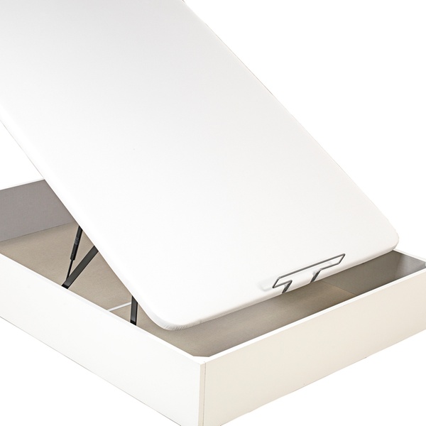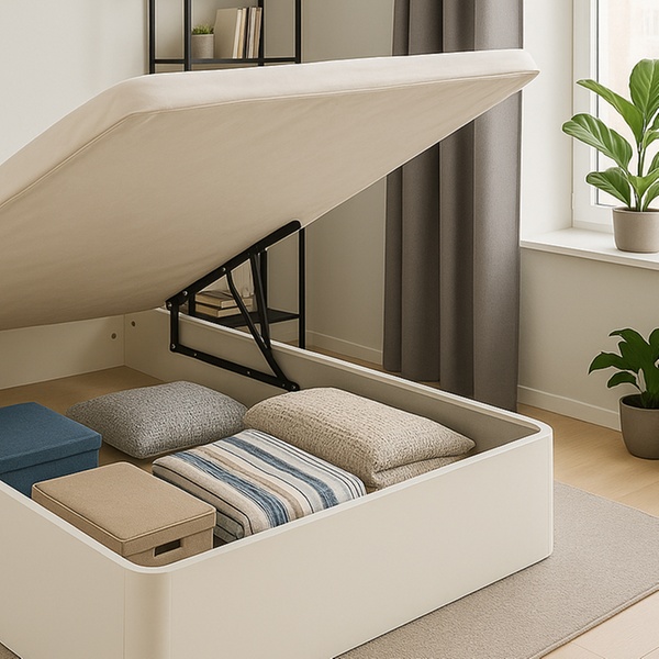 El canapé cuenta con una tapa abatible y pistones hidráulicos para una apertura suave y sin esfuerzo, ideal para maximizar el espacio