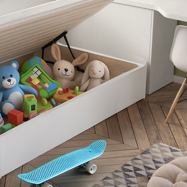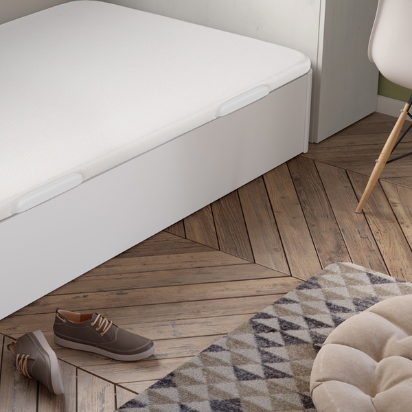 Con pistones hidráulicos, este canapé con base tapizada y laterales de madera permite abrir y cerrar fácilmente, maximizando el espacio de almacenamiento en el dormitorio