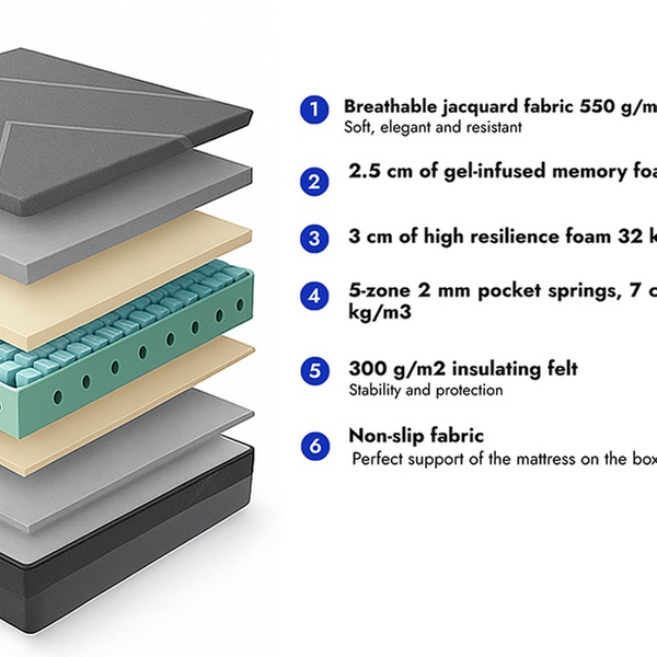 - Espuma viscoelástica de gel (2,5 cm, densidad 40 kg/m³): se adapta a los contornos del cuerpo, alivia los puntos de presión (espalda, hombros, caderas) y reduce microdespertares. Ideal para personas con dolor lumbar o articular.