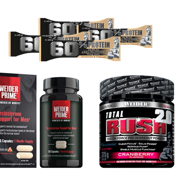 Pre-entreno, barrita, proteína y regulador hormonal para favorecer la musculación