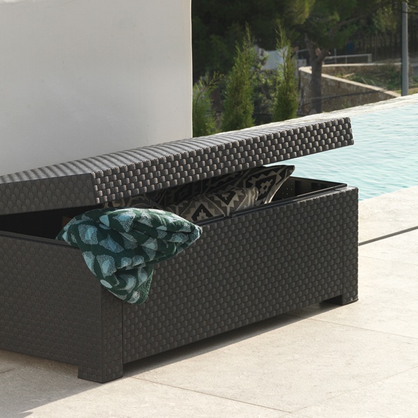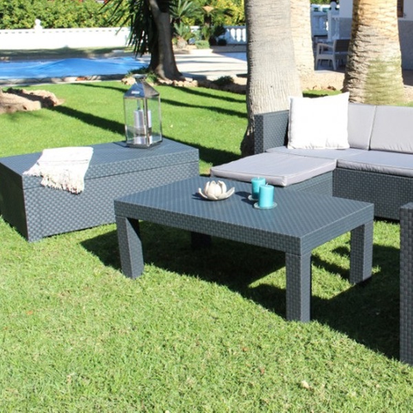 Set de muebles de jardín con un diseño moderno compuesto por un sofá de 3 plazas, 2 sillones y una mesa de centro