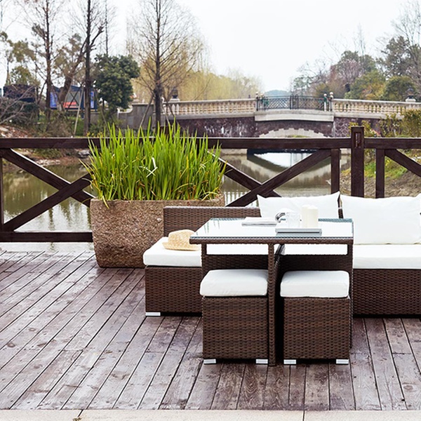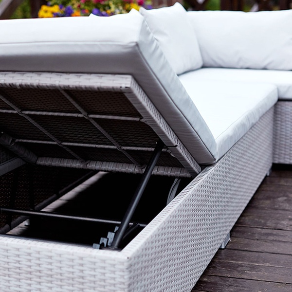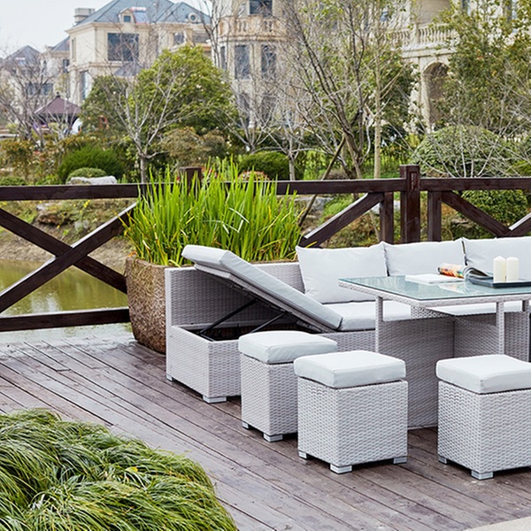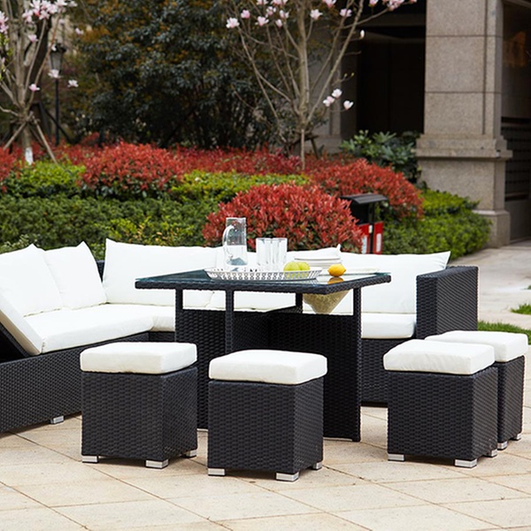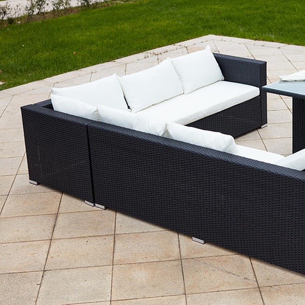 Este conjunto de jardín para 10 personas incluye un sofá de esquina con parte reclinable, una mesa y 4 pufs para pasar las tardes al sol