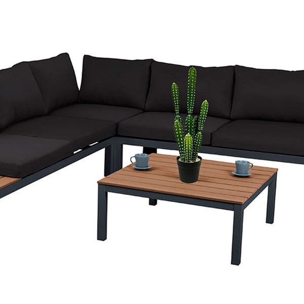 Este set incluye 1 mesa rectangular, 2 bancos y 1 sofá con rinconera y cojines, ideal para relajarse en el jardín