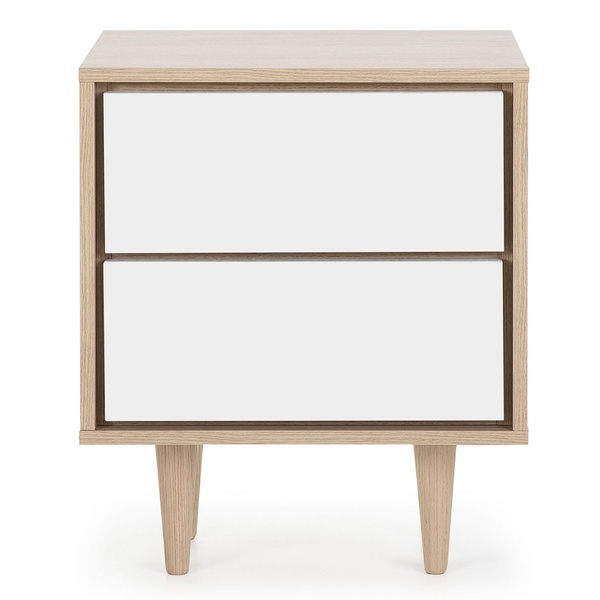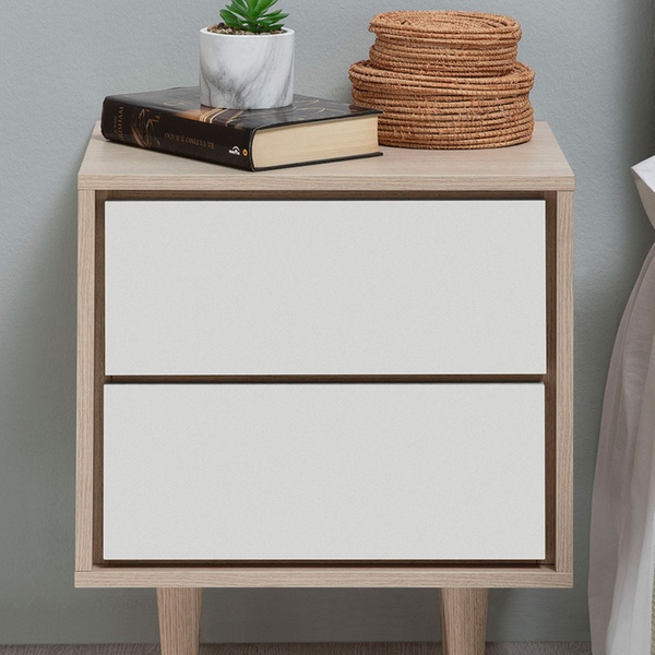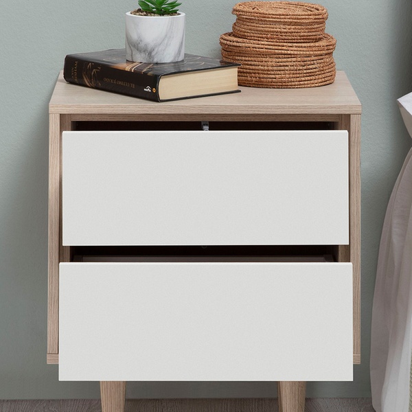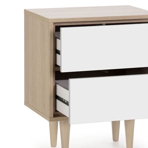 - 2 cajones en color Roble o Blanco con guía metálica para fácil extracción, maximizando el espacio de almacenamiento.