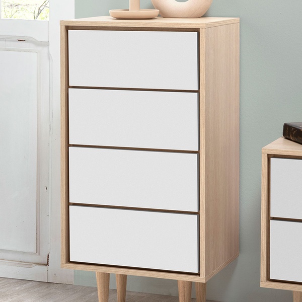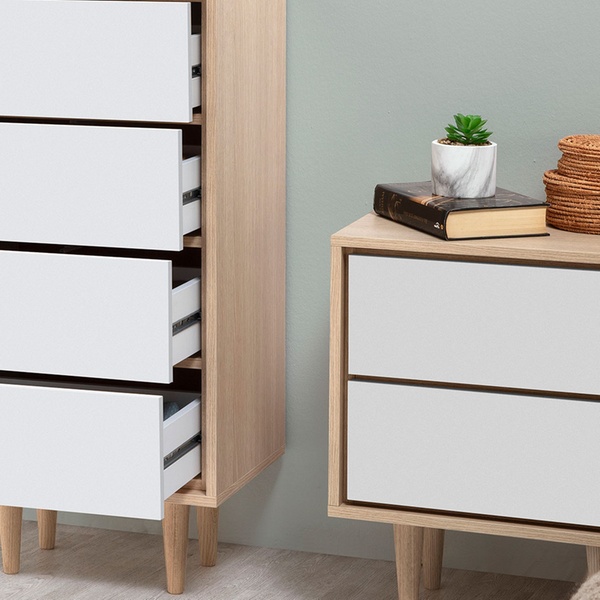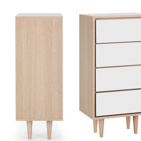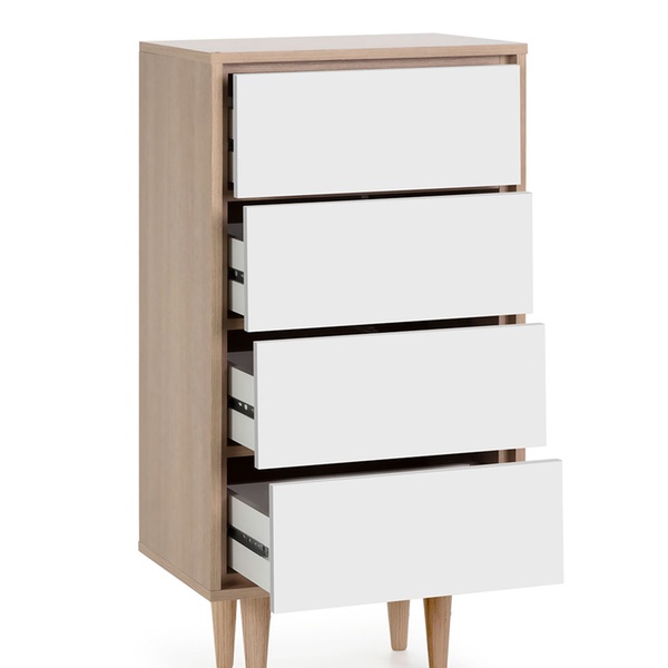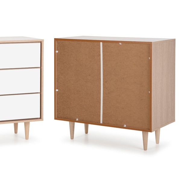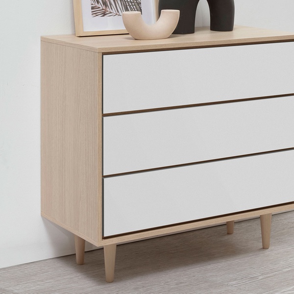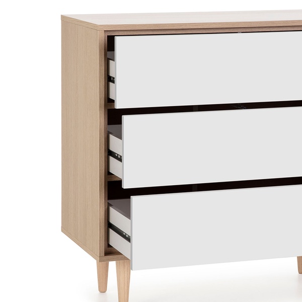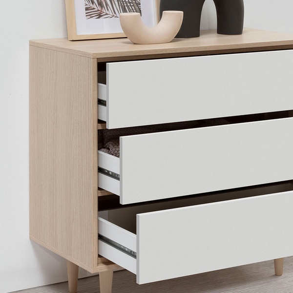 - 3 cajones en color Roble o Roble y Blanco con guía metálica para fácil extracción, maximizando el espacio de almacenamiento.