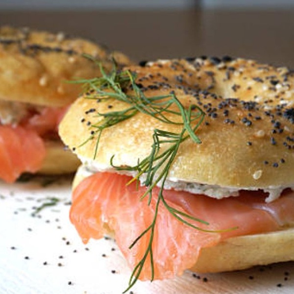 - Bagel de queso Philadelphia, aguacate, salmón, sésamo y amapola