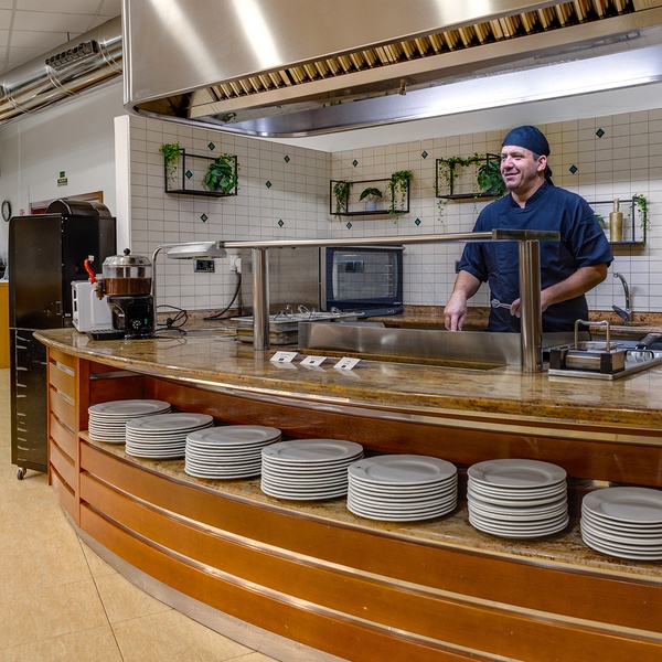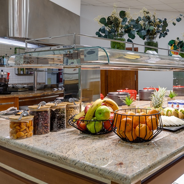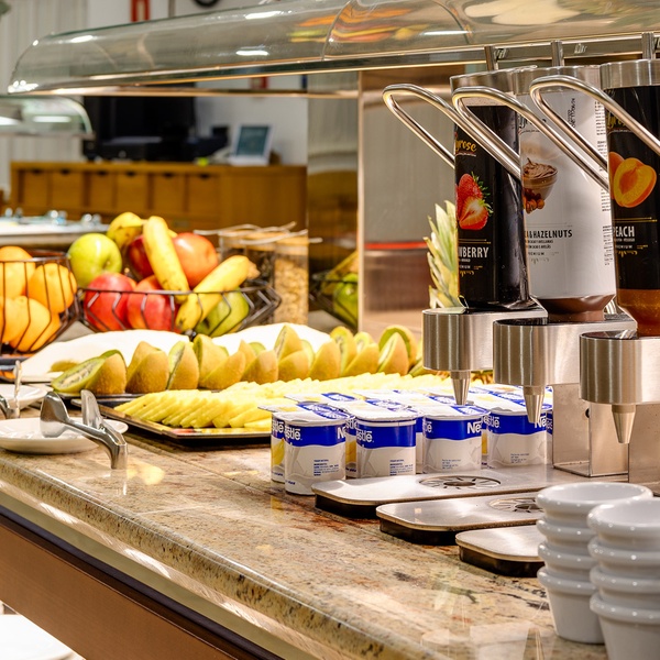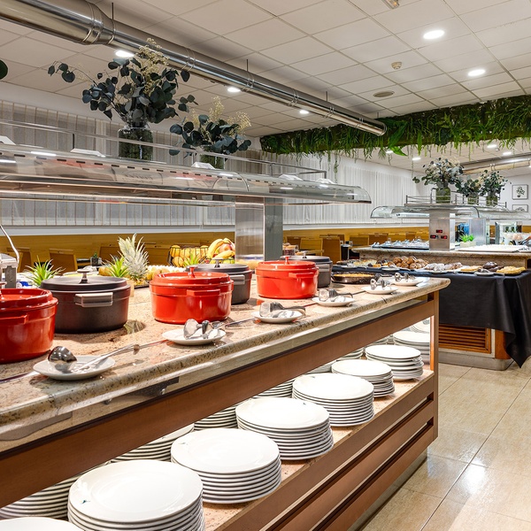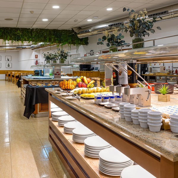 El desayuno buffet incluye una sección de show cooking con tortillas variadas, bollería, con croissants, napolitanas, galletas, cereales, etc., fiambres y embutidos, con jamón, queso, chorizo y jamón york, entre otros, zumos varios, de naranja, piña, melocotón... y cafés.