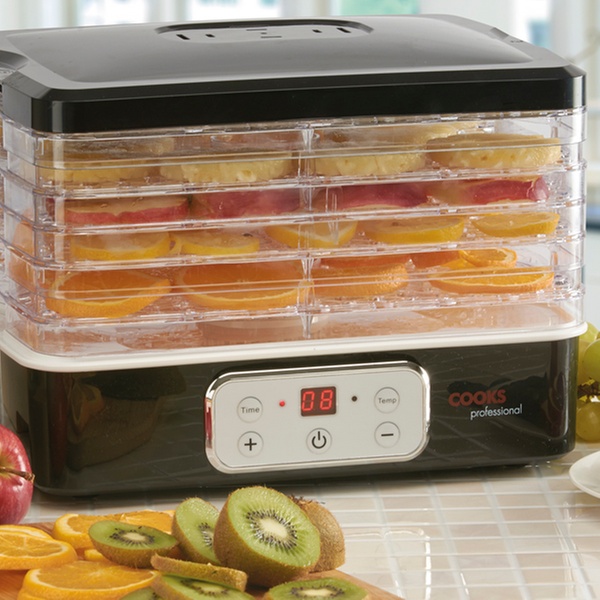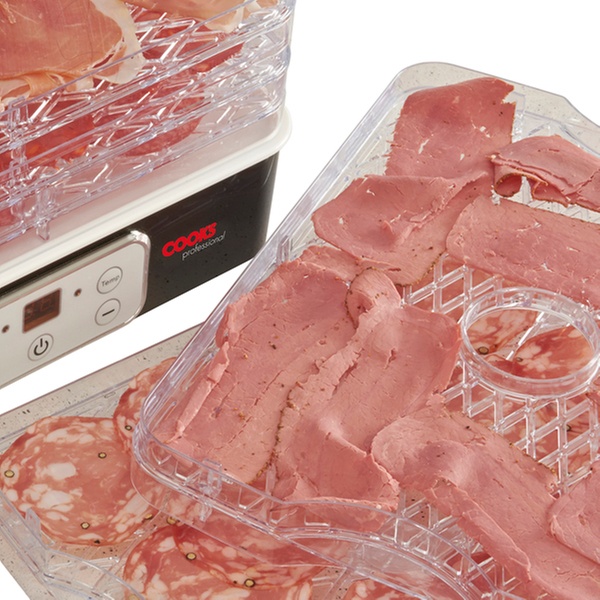 Deshidratador de 6 niveles con bandejas intercambiables que permiten alterar la profundidad de bandejas para acomodar diferentes alimentos