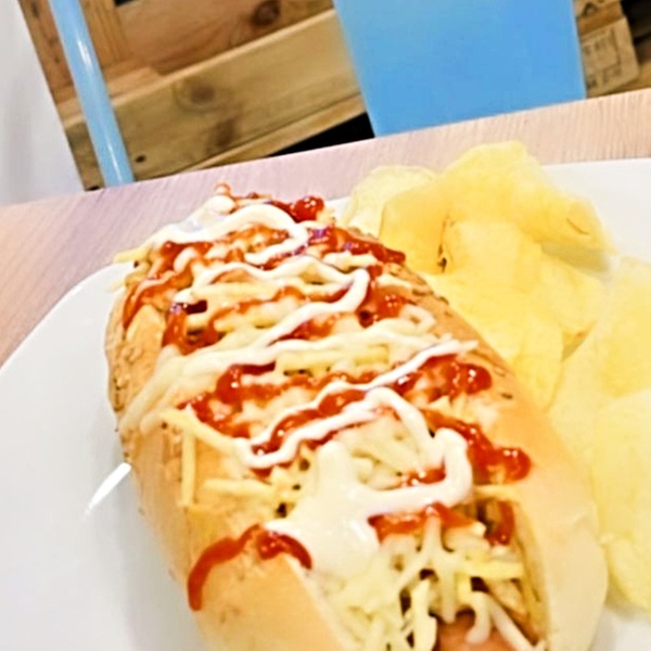 Perro Caliente Especial: pan, salchicha, ripio de papa, salsas, beicon, ensalada, queso y cebolla frita