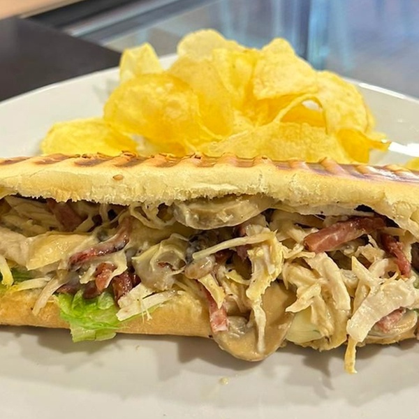 Sandwich Cubano: pollo mechado una deliciosa salsa de la casa, champiñones, beicon, lechuga y queso