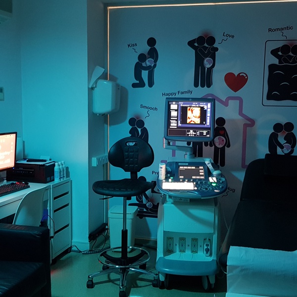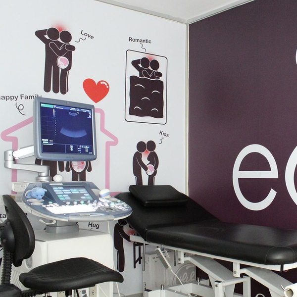 Disponen de una sala recién renovada en 2018, con un cómodo sofá, 3 monitores en sala para no perder detalle de la ecografía, decoración acorde al servicio emocional y diferentes ambientes de iluminación, según si el bebé es niño o niña.
