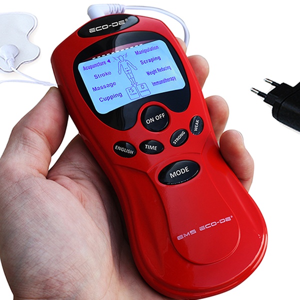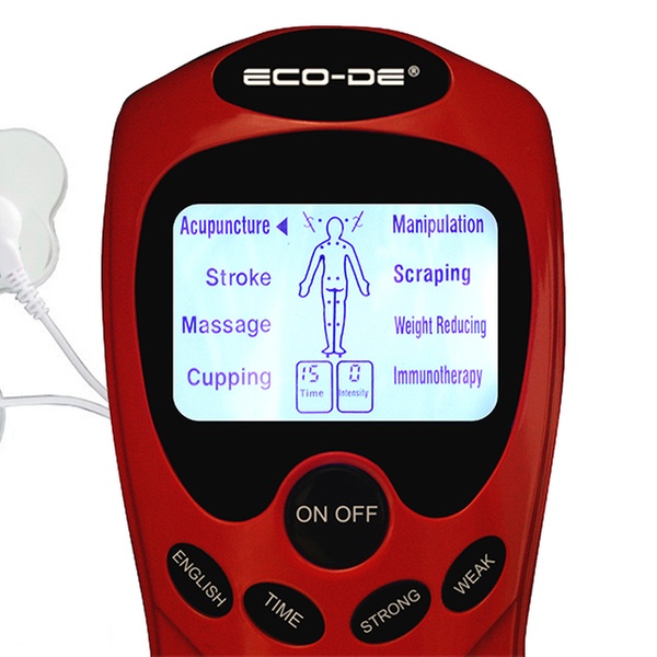 - La pantalla LCD indica los 8 modos de estimulación junto con los puntos meridianos de acupuntura humana, la intensidad de impulso y el tiempo de uso