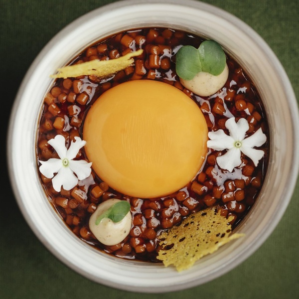 - Yema de huevo de caserío sobre estofado de trigo (Farmhouse egg yolk on wheat stew)