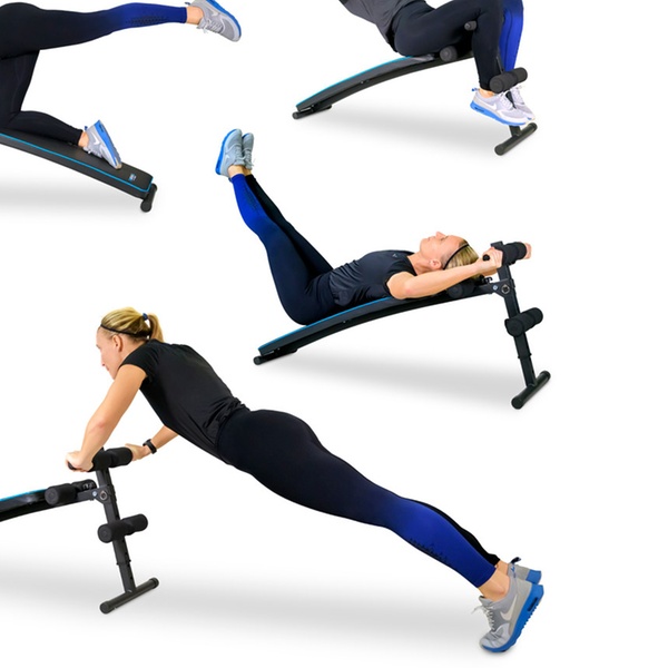• Respaldo ajustable, rodillos de espuma para sujetar pies y asas antideslizantes para flexiones.