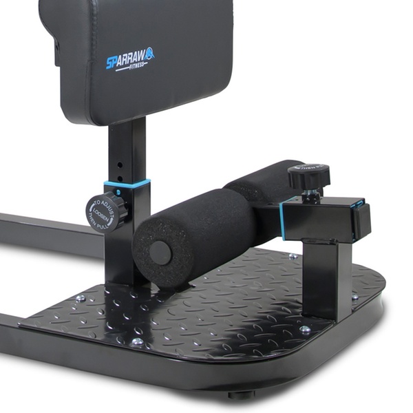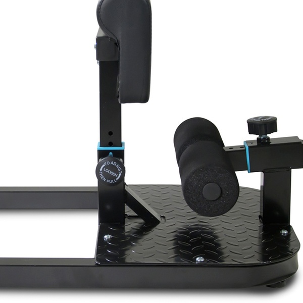 • Respaldo ajustable (35–50 cm) y rodillos de espuma para realizar crunches, elevaciones de piernas, flexiones, dips y press de banca.