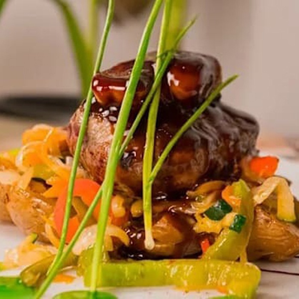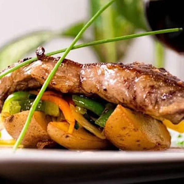 - Presa ibérica con guarnición de patata, verduras y salsa de Pedro Ximénez