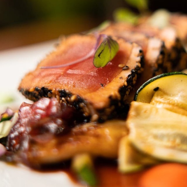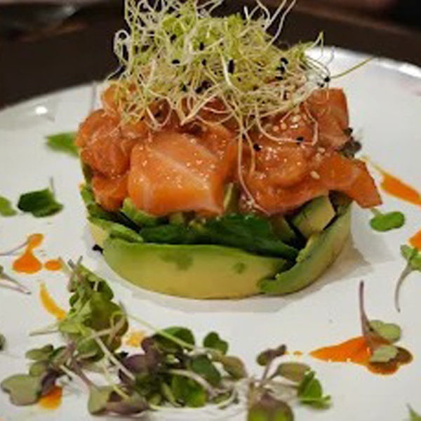 - Tartar de salmón macerado con vinagreta de mostaza, aguacate, sésamo, soja
