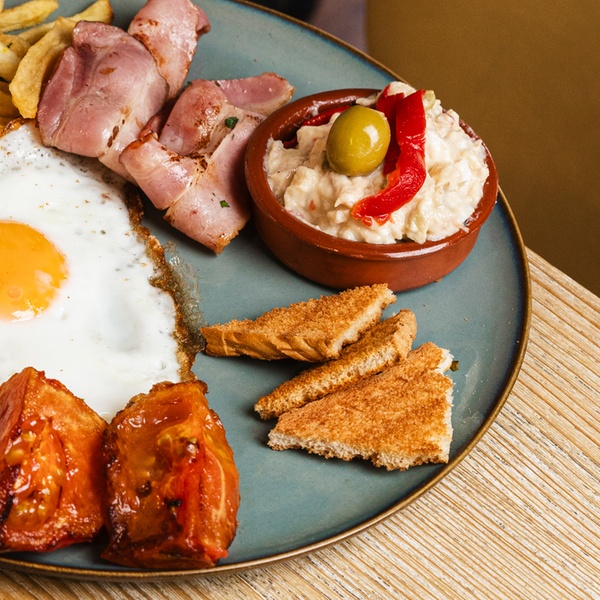 - Huevos fritos con tocino, tomate asado, queso de cabra y jamón ibérico