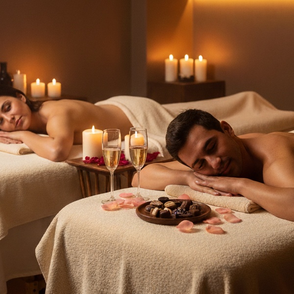 - Ritual de masaje relajante en pareja de 60 minutos con copa de cava y bombones