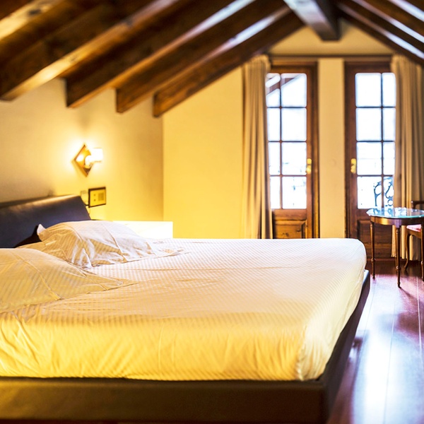 - Las luminosas habitaciones dobles, situadas en el edificio Xalet, con vistas al jardín con piscina del hotel o al pueblo de la Aldosa-Anyos, disponen de 2 camas individuales o cama matrimonial, mesa de trabajo y rincón de lectura.
