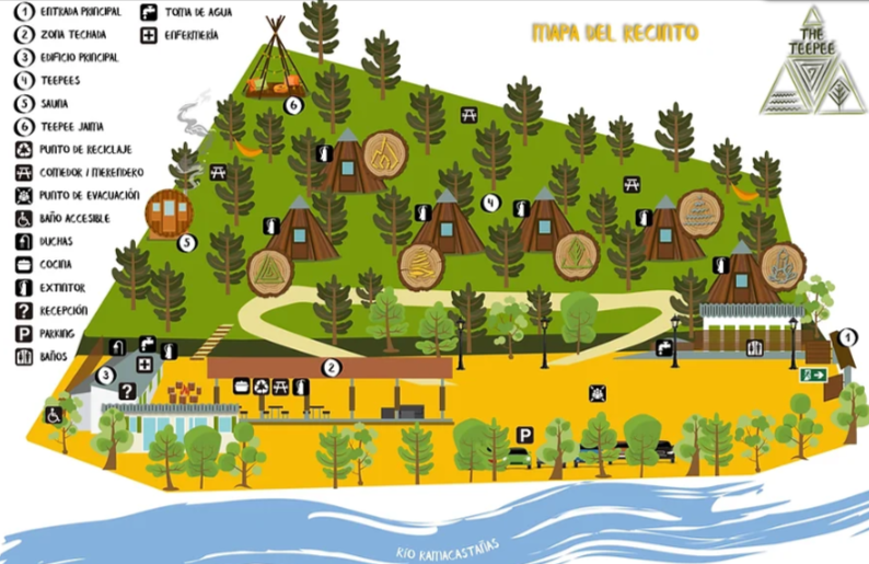 El Glamping consta de seis cabañas tipo tipi con capacidad para 2 personas, provistas con ropa de cama y toallas. La cocina y las zonas de relax son comunes, para favorecer que los huéspedes puedan relacionarse entre ellos mientras se relajan en las sillas columpio, hamacas o, según la temporada, sillones al pie de la estufa y bar-restaurante. También consta de piscina natural y zona recreativa, además de una barbacoa. Los baños y duchas de agua caliente son privados y pueden cerrarse con llave.