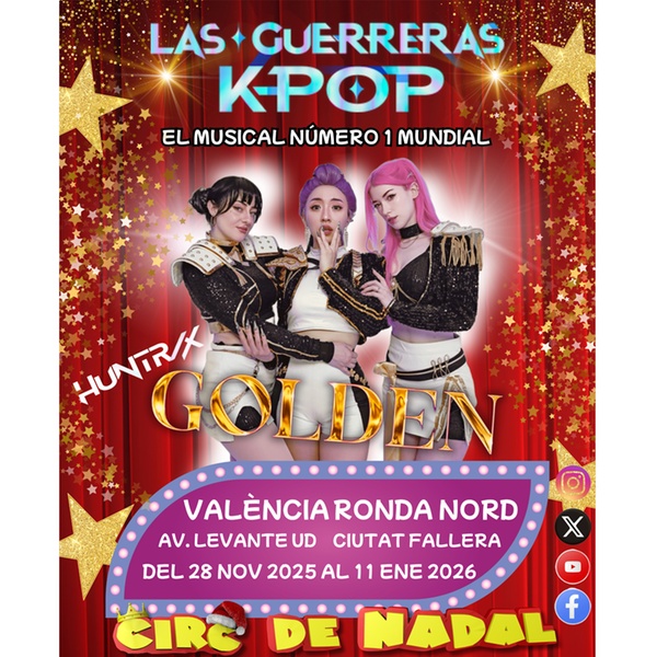 El Circ de Nadal ofrece un espectáculo sin precedentes que fusiona el arte circense tradicional con la modernidad del K-Pop en un formato musical. El show incluye actuaciones en vivo de las Guerreras HUNTR/X (Rumi, Mira y Zoey), cantando y bailando su éxito global "Golden" y otros temas, en una hermosa historia sobre el poder de la amistad. Podrás disfrutar también del Gran Festival Internacional del Circo que reúne a trapecistas, acróbatas, magos, gimnastas y muchos otros artistas de las escuelas de circo de los cinco continentes. Con impresionantes grupos de animales (búfalos highland, camellos, watusis, etc.), además de grandes parodias cómicas de payasos internacionales.